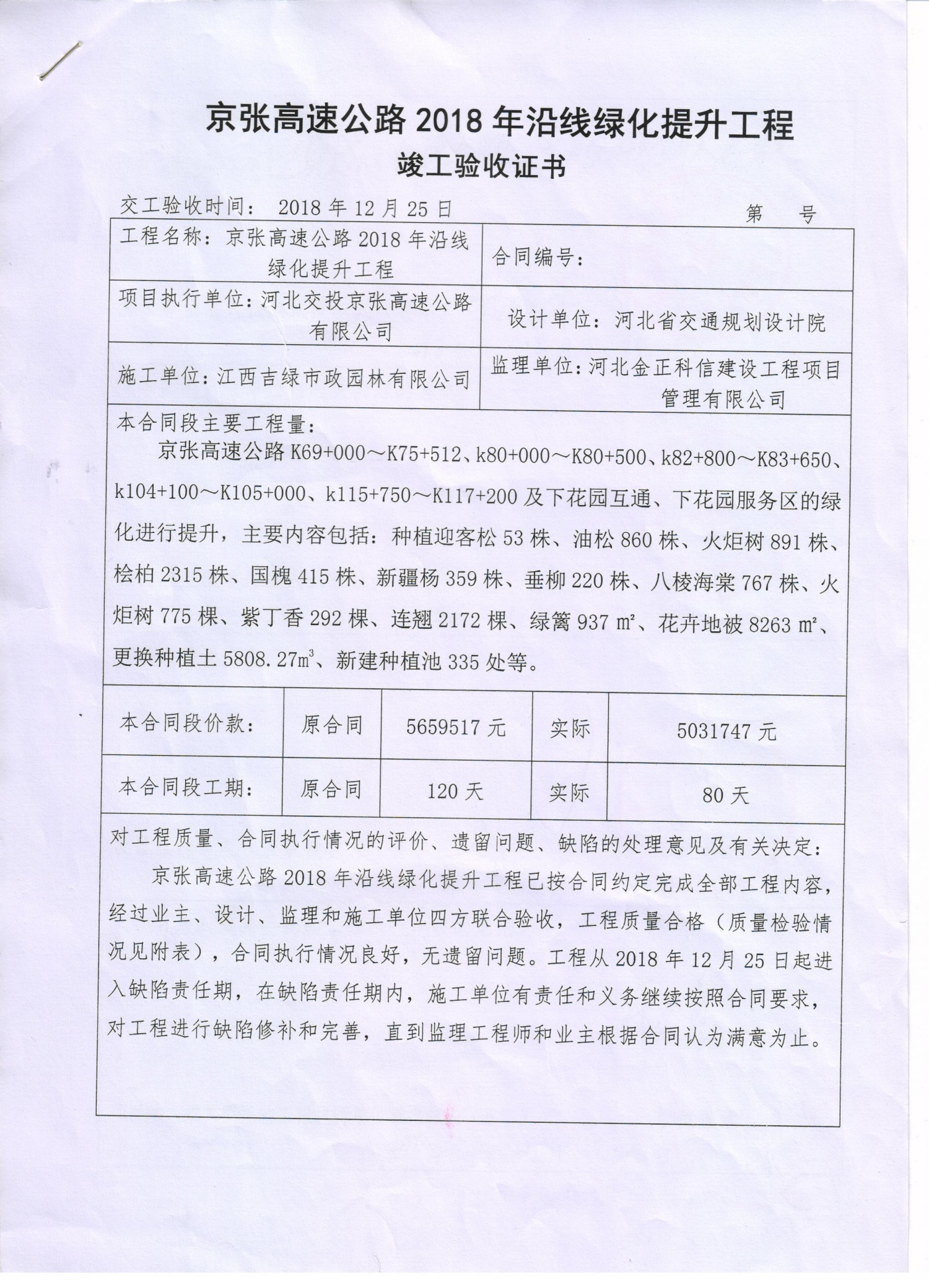 京張高速公路2018年沿線綠化提升工程竣工驗(yàn)收證書